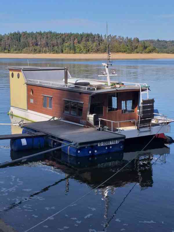 2 typ - Hausbot 11,7x3m, vhodný na celoročné bývanie aj na rekreáciu, možné umiestniť kdekolvek no vodnú plochu, priestranný ľahký, stabilný, motorový aj staticky určený komfortne pre 2-6 čl. posádku... Vyhotovený na 12 plastových plných plavákoch, medzi plávakmi je inštalovaná nádrž na odpad. vodu 2m3